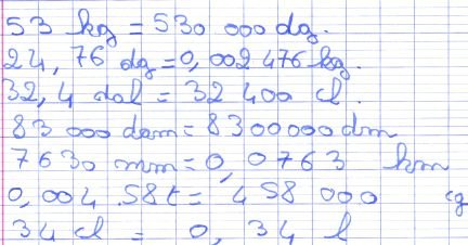 53 kg en dg ; 24,76 dg en kg ; 32,4 daL en cL ; 83 000 dam en dm ; 7 630 mm en hm ;